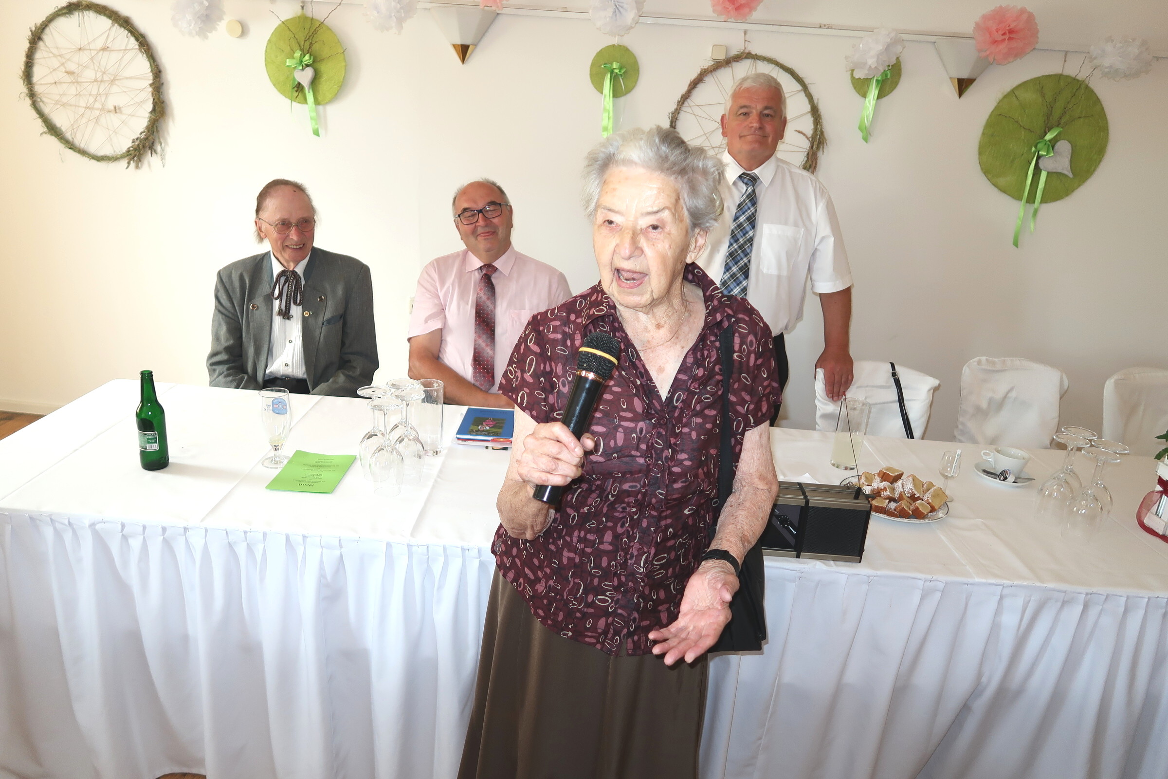Der Obmann Sepp Timischl mit seinem Team des Seniorenbundes M. Hartmannsdorf luden zur Geburtstags-, Hochzeits- und Jubilarfeier am Sonntag, den 10.6.18 ein .Mit einem festlichen Gottesdienst in der Pfarrkirche Markt Hartmannsdorf wurde diese Feier begonnen. Anschließend gab es ein Gruppenfoto vor der Kirche und im Anschluss daran wurden die Jubilare zu einem feinen Mittagessen ins Gh Huber eingeladen. Als BO dufte ich gemeinsam mit dem Bürgermeister Ottmar Hiebaum und anderen Ehrengästen den Jubilaren gratulieren .Die älteste Jubilarin war Frau Maria Sonnleitner im 103 Lebensjahr( 30.10.1915) Als Höhepunkt ihres Kommens brachte sie ein Gedicht zum Besten. Die geladenen Festgäste staunten über ihre Darbietung und bedankten sich mit großem Applaus. Geistig voll da, fesch beinand, so wäre es schön, alt zu werden und das in der eigenen Familie. Herzliche Gratulation an die Ortsgruppe für diesen feinen Tag .